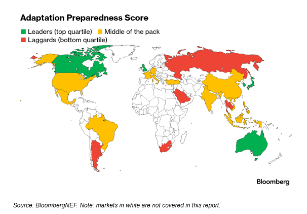 According to BNEF, high-scoring countries like Canada, Singapore and South Korea have taken critical steps to build resilience and are best equipped to manage the economic impacts of physical climate change.