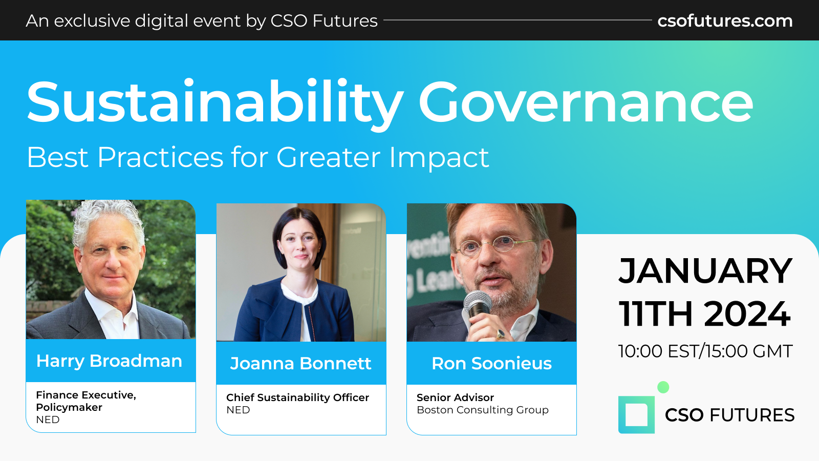 Starting at 15:00 GMT (10:00 ET), Joanna Bonnett, independent Chief Sustainability Officer and NED, Harry Broadman, finance executive and NED, and Ron Soonieus, Senior Advisor at BCG, will discuss how to best structure boards, sustainability committees and the CSO function for greater sustainability impact.