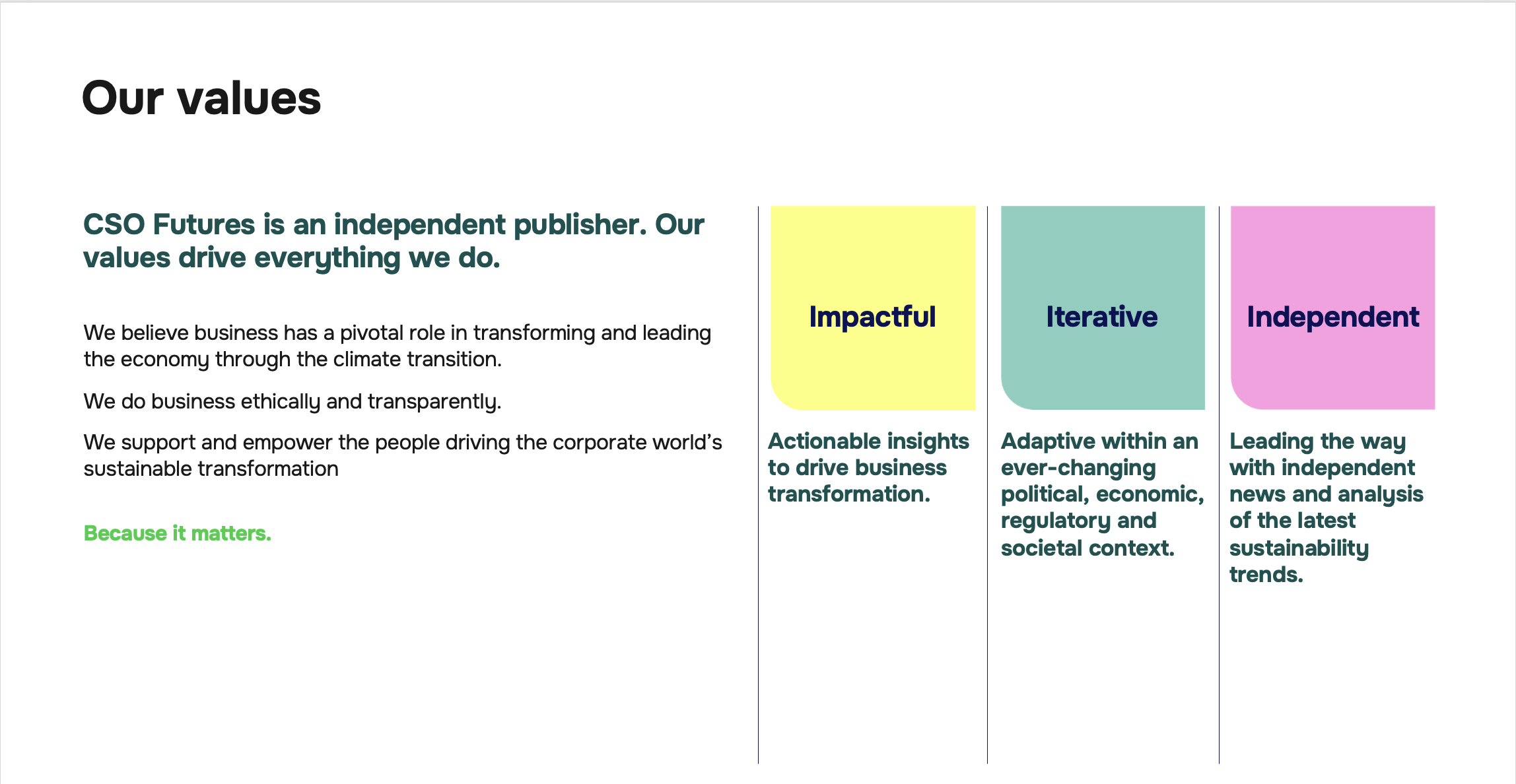 We believe business has a pivotal role in transforming and leading the economy through the climate transition. We support and empower the people driving the corporate world's sustainable transformation. Because it matters.